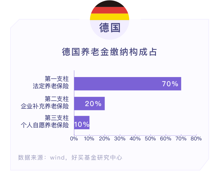 德国是最早确立现代化养老制度的国家了,第一支柱——由雇员和雇主各负担一半的法定养老保险占大多数,也正在积极努力将第二、第三支柱从现在的补充低位逐步提升到与法定养老保险相近的支柱低位。